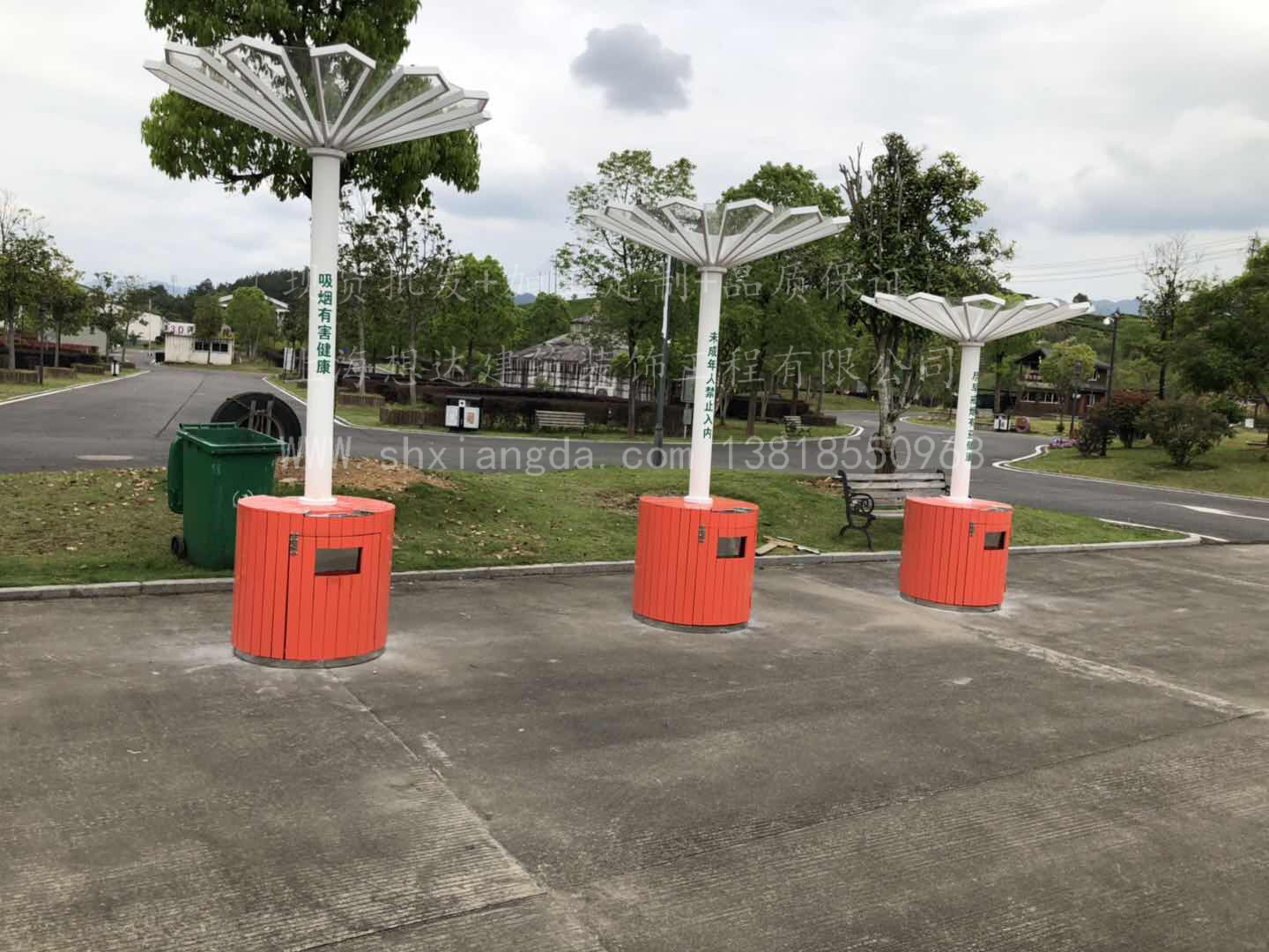 自游小鎮(zhèn)2號吸煙亭,2號吸煙亭為花型,造型比較美觀,既可以當(dāng)做吸煙亭又可以當(dāng)初風(fēng)景來看待。頂部采用鍍鋅方管造型焊接,上鋪5mm透明耐力板。下襯圓柱形垃圾桶,方便,美觀。