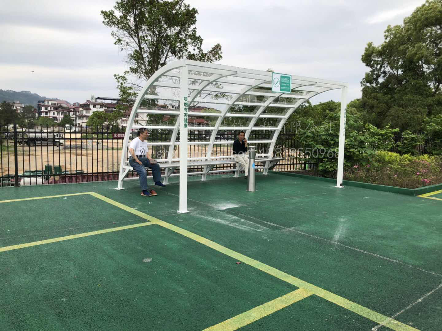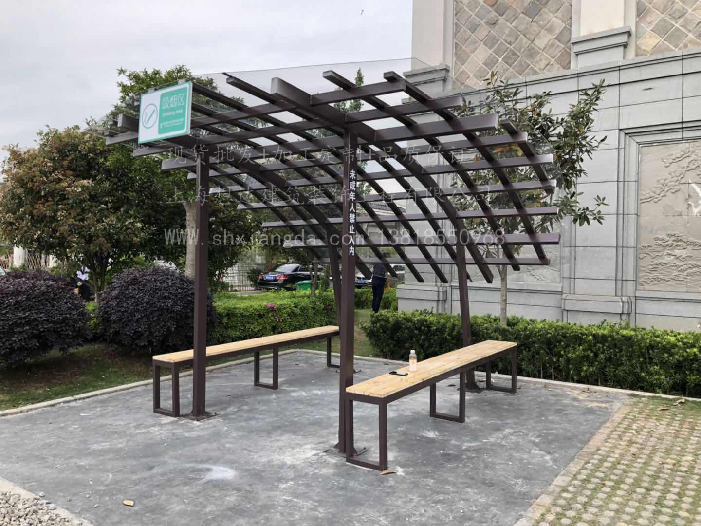 自游小鎮(zhèn)3號,4號吸煙亭。3號4號吸煙亭造型是一樣的,采用60*120方管拉彎成型,采用前高后低的做法,頂部上鋪5mm耐力板,防雨,下雨天也可以避免淋濕。