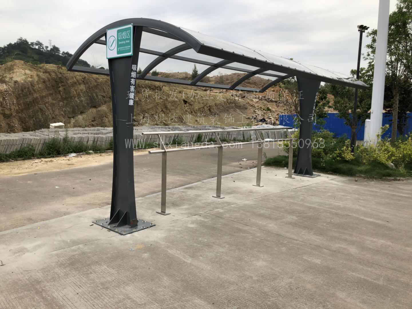 中華武夷茶博園1號吸煙亭,茶博園吸煙亭立柱均采用60*120鍍鋅管拉彎工藝,頂棚外鋪5mm耐力板抗風(fēng)壓。整體骨架采用激光無縫焊接,外噴金屬漆,建議美觀。